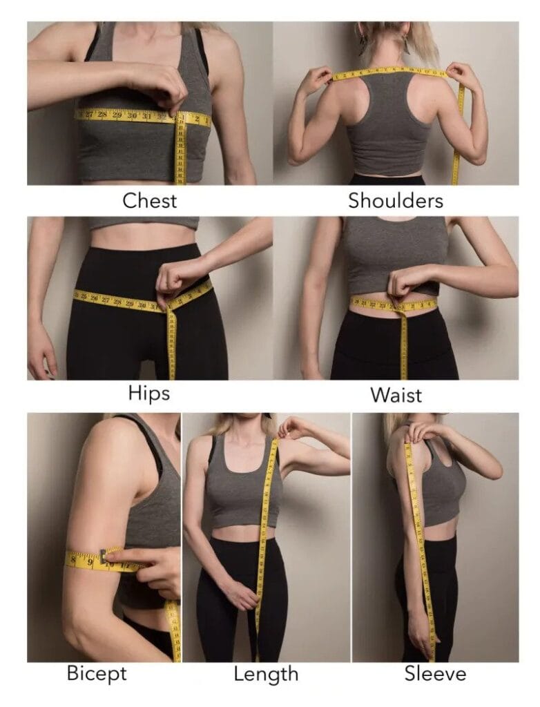 Chest, Shoulder to Shoulder, Sleeve Length, Hips, Waist, Length, Biceps (optional), Stomach (optional)